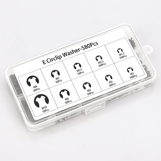 580PCS Black Alloy Steel E-Clip Assortment Kit, E-Clip Assortment Set Include 10 Sizes, Retaining Rings for Bearings, Gears, Pulleys, Axles (M1.5-M10)