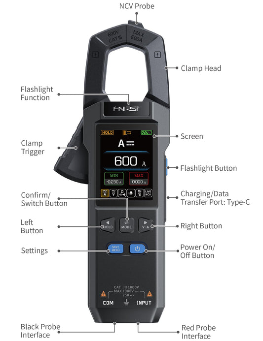 FNIRSI DMC-100 Digital Clamp Meter Multimeter 9999 Counts TRMS, 600A Curve Recording Rechargeable Amp Meter, Measures NCV, AC/DC Voltage Current, Continuity Capacitance Diode Resistance, Temperature