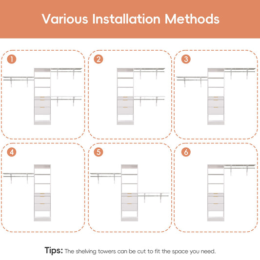 Closet System, 8FT Closet Organizer with 3 Wooden Drawers, Walk-in Closet Wardrobe Clothes Rack with 3 Expandable Hanging Rods, Garment Rack, White