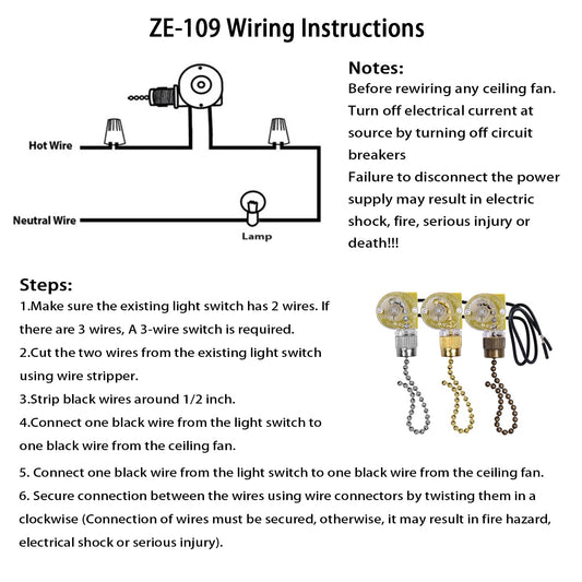 Akahttbn Ceiling Fan Light Switch Zing Ear ZE-109 Two-Wire With Pull Cords for Fans, Lamps and Wall Lights - Pull Chain Control Replacement On-Off, 2 Pcs Bronze