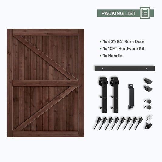 ROYMELO 60x84 inch Sliding Barn Wood Door Slab with 10ft Hardware Kit and Handle, Coffee, K Shape, Simple DIY Assembly