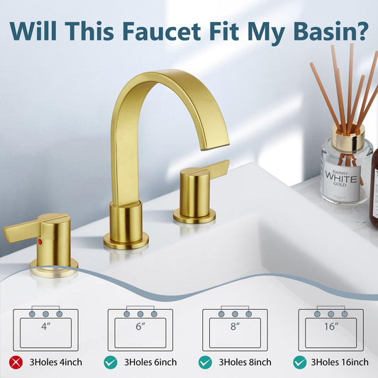 Aolemi Waterfall Bathroom Faucets 3 Hole 8 Inch Widespread Bathroom Sink Faucet 2 Handles with Pop-up Drain and Supply Hose Suitable for Vanity RV Restroom Brushed Gold