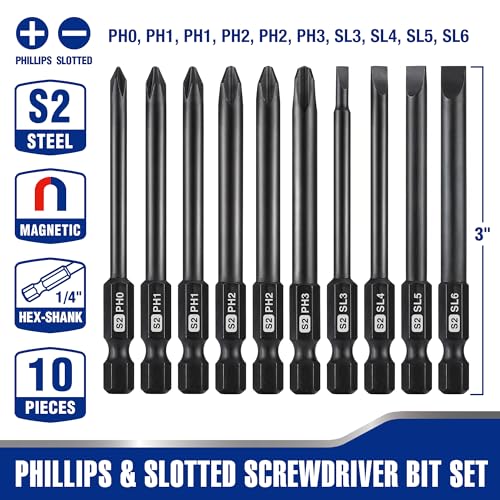 WORKPRO 10pcs Slotted Phillips Screwdriver Bit Set, S2 Steel Magnetic Screwdriver Bits Set, CNC Machined Tips, 1/4 Inch Hex Shank Driver Bits, 3 Inch Long Screwdriver Bits Set with Storage Box
