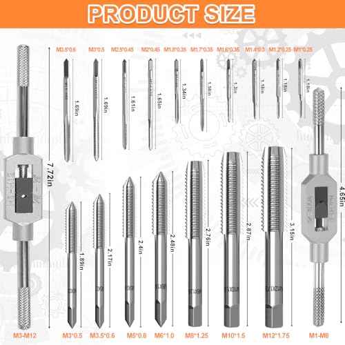 Metric Tap Set 19Pcs, Tap and Die Set, Hand Screw Thread Taps Set, Mini Metric Plug Tap Screw Tap Drill Tap Drill Set Tapping tool M1-M3.5 M4 M5 M6 M8 M10 M12 with 2 Adjustable Tap Wrench Tool