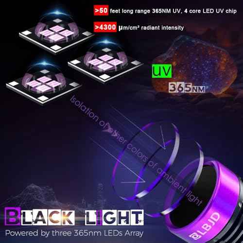 Blacklight UV Flashlight, Tri-Core 365nm Woods lamp, High Power Rechargeable Black Light with Filter - Detector for Pet Urine & Leak, Searching Rocks/Scorpion, Resin Curing, Yooperlite