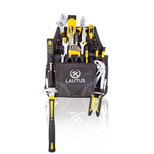 LAUTUS Oil Tanned Leather Tool Pouch Bag | Carpenter, Construction, Framers, Handyman | 10 Pockets, 2 Hammer Holders | 100% Leather Dark Brown