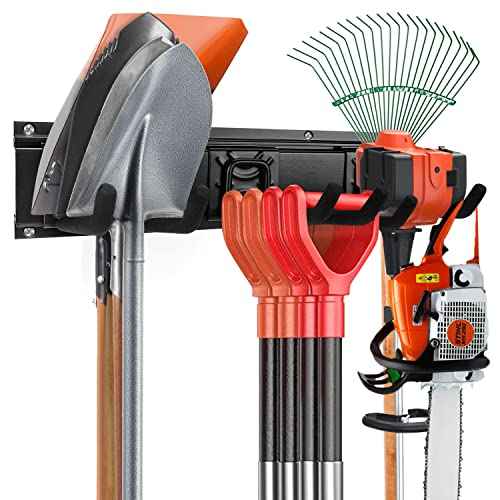 Garden Tool Storage Rack, Outdoor Power Tools Hangers for Garage Wall Organization with 6 assorted Multi-Purpose Hooks, Organizer Holders for Landscaping Equipment, Folding Chairs, Ladders etc.
