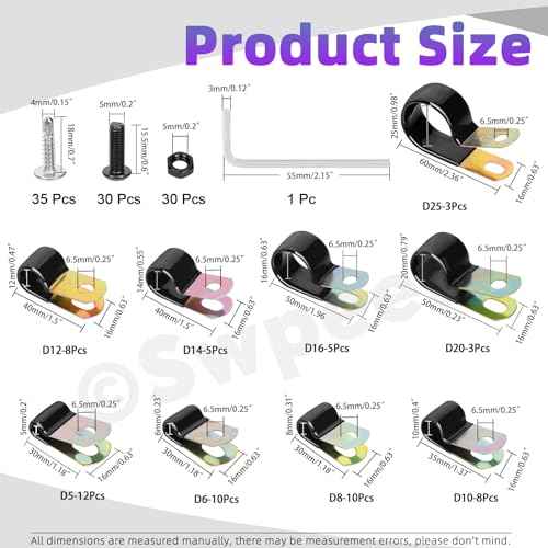 Swpeet 64Pcs 9 Size 5mm-25mm 1/4" Hole Vinyl Coated Cable Clamps Galvanized and 95Pcs Hex Screws Nuts Assortment Kit, Rubber Cushioned Insulated Clips, Metal Wire Clamps for Pipe Cables Wires