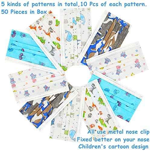 Kids Disposable Face Mask 50 Pack Ages 5-12 Filter 3-Layer Safety Face Masks for Kids Daily Use.All Metal Nose Clips(Multicolored)
