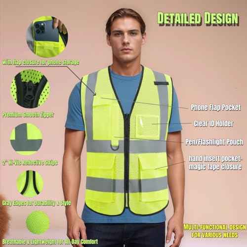 Construction Vest for Men Women, Hi Vis Mesh Vest with Pockets, High Visibility Safety Vest with Reflective Strips for Workers/Contractors/Surveyors/Drivers, ANSI Compliant, (UB-Yellow, M)
