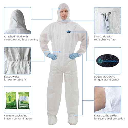 VVicogard Protective Overalls Disposable Coveralls, Front Zipper Elastic Waistband & Cuffs Ankles, SMS Isolation Coverall Suit with Hood for Hospitals, Laboratories, Medical