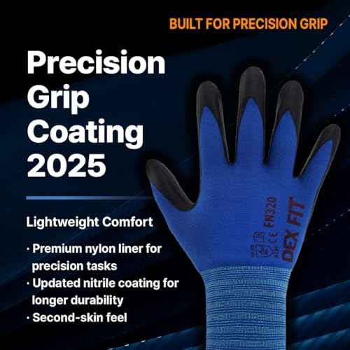 DEX FIT Nylon Work Gloves FN320, 3D Comfort Fit, Power Grip, Lightweight, Touchscreen for Men & Women, Breathable & Flexible for Yard Work DIY Mechanic Warehouse; Black 7 (S)