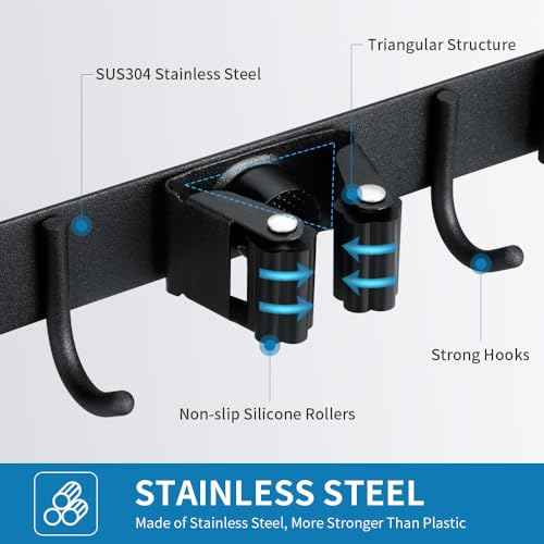 Broom Hanger and Mop Holder, Heavy Duty Garden Tool Organizer Rack Rake and Shovel Handle, Stainless Steel Wall Mounted Utility Rack with Screws (3 Racks with 4 Hooks, Matte Black).