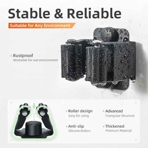 Broom Holder Wall Mount, Stainless Steel Mop and Broom Organizer, Broom Hanger with 2 Slots 2 Hooks for Home Kitchen, Garage, Garden and Laundry Room, Black