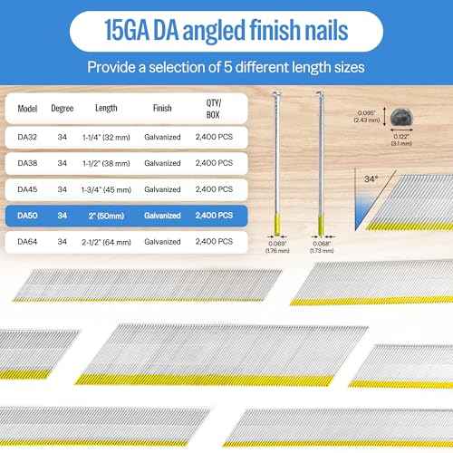 meite 15 Gauge Angled Finish Nails 2 Inch 34 Degree Nails for Pneumatic Electric Finish Nailer Gun, Galvanized No-Rust Finishing Nail for Cabinet Crown Baseboard Door Trim, DA Series 2,400 PCS