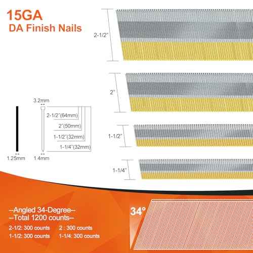 15 Gauge DA Angled Finish Nails, 34-Degree, 1200-Pack (2-1/2", 2", 1-1/2", 1-1/4" 300 Per Sizes), Galvanized Assorted Size Project Pack, for Pneumatic, Electric Angled Finish Nailer Gun