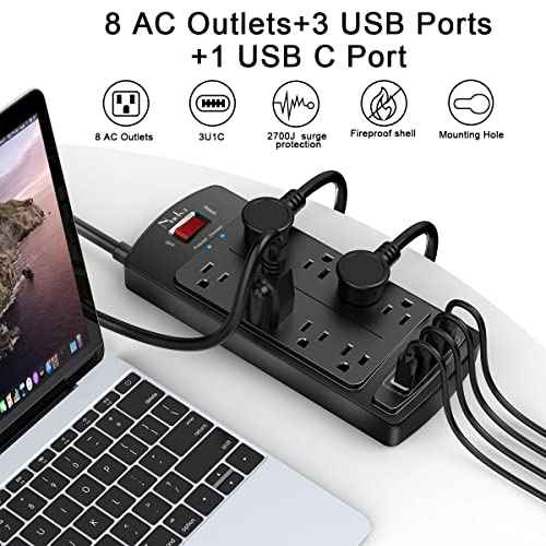 Surge Protector Power Strip - Nuetsa Flat Plug Extension Cord with 8 Outlets and 4 USB Ports, 6 Feet Power Cord (1625W/13A), 2700 Joules, ETL Listed, Black