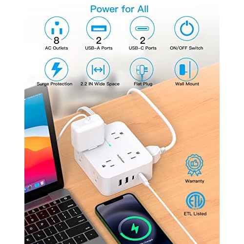 Power Strip Surge Protector, BESHON 5Ft Extension Cord, 6 Outlets with 4 USB Ports (2 USB C Outlet), 3-Side Outlet Extender, Wall Mount, Compact for Travel, Home, School, College Dorm Room and Office