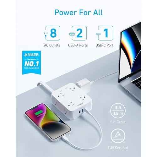 Anker Surge Protector Flat Plug Power Strip 2000J, 5ft Thin Extension Cord, 8 Outlets,2 USB A and 1 USB C Port,20W for iPhone15,Wall Mount,Compact for Home,Office,Room,TUV Listed