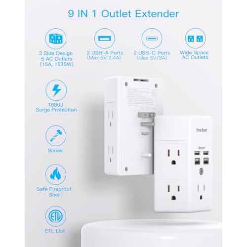 One Beat 1680J 3 Side Power Strip Multi Plug Expander, Surge Protector, 5 Outlets Extender, 4 USB Ports (USB C), Wall Mount Charger, Outlet Splitter Adapter for Home, Travel, Office, ETL Listed, White