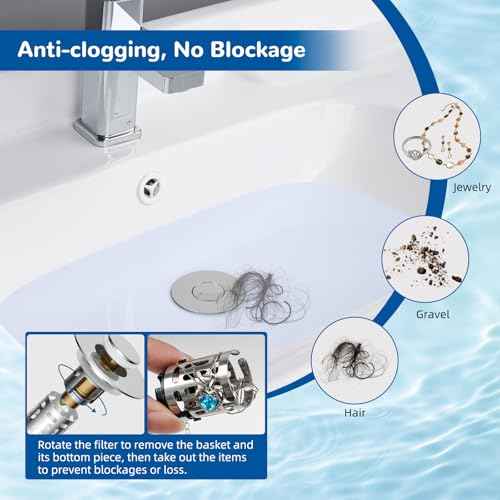 Hibbent Upgraded 3 in 1 Bathroom Sink Drain Strainer, Universal Pop Up Stopper with Removable Stainless Steel Filter Basket Hair Catcher, Sink Plug for 1.1''~2.36'' Basin, Brass Bullet Core, Chrome