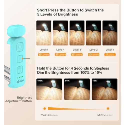 Gritin Reading Light, Rechargeable Book Light for Reading in Bed - Eye Caring 3 Color Temperatures, 5-Level Dimmable Brightness, Long Lasting, Compact Size Clip on Book Lamp for Bookworms-Blue