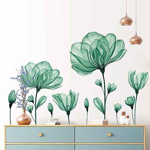 3D Dreamy Green Flowers Wall Decals Romantic Lily Blossom Floral Wall Stickers DIY Removable Watercolor Flower Plants Peel and Stick Vinyl Decor for Kids Girls Bedroom Living Room Nursery DT-1523