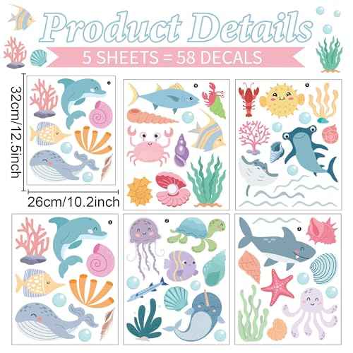 Ocean Life Wall Decals for Kids ? 5 Sheets Colorful Sea Creatures Wall Stickers ? Removable Underwater Animal Peel and Stick Decorations for Bathroom, Nursery, Bedroom (10.2x12.5 inch Sheets)