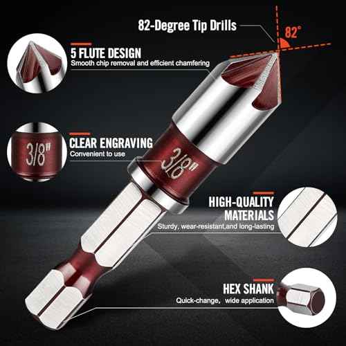 5Pcs Countersink Drill Bit Set, Premium Drill Bit with 82-Degree, 5 Flutes, Quick-Change Hex Shank, 1/4 Inch to 3/4 Inch Size, Counter Sink Bits for Wood, Metal, Plastic