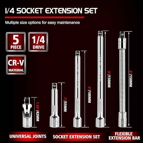 5-Piece 1/4 Inch Drive Extension Bar Set, Includes 2, 4, and 6 Inch Extensions, 1/4 Inch Drive Universal Joint Socket and Flexible Socket Extension Bar