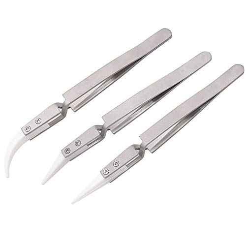 YAKAMOZ 3pcs Precision Reverse Ceramic Tweezers Non-Conductive, Heat Resistant, Anti-Magnetic Pointed & Curved Tips Tweezer Set for Pinching Coils While Firing