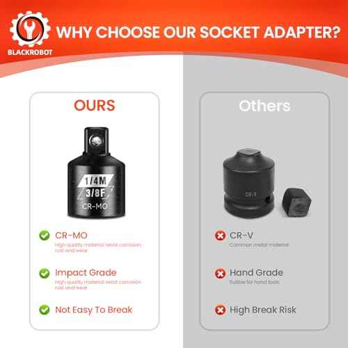 BLACKROBOT 2PCS Socket Adapter and Reducer Set, 3/8" to 1/4" & 1/4" to 3/8" Impact Socket Set, SAE Drive Cr-Mo Steel Exceeds ANSI Standards, Square Drive for Impact Driver Wrench