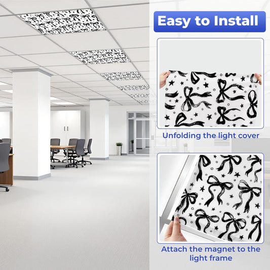 4 Pcs Fluorescent Light Covers for Ceiling Lights Bow ribbon pattern seamless print white black Christmas Cute crayon Decorative Magnetic Classroom Light Filters 4x2 ft for Office Hospitals Home