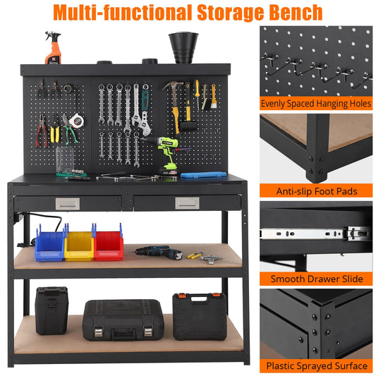 FinerFurnis 3-Tier Metal Workbench with 2 Drawers, Heavy Duty Workstation with Power Outlets and Pegboard, Durable Workshop, Office, and Home Work Bench