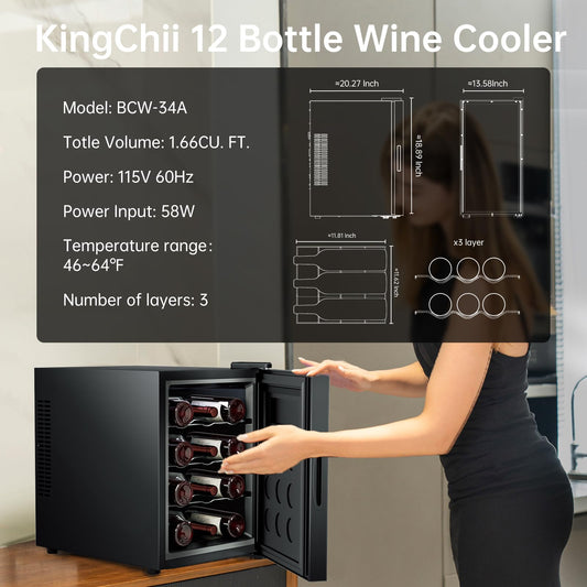 KingChii 12 Bottle Wine Cooler, Freestanding Wine Fridge with Glass Door, Adjustable Shelves & Digital Temperature Display Wine Refrigerator for Red, White, Champagne - Perfect for Home, Kitchen, Bar