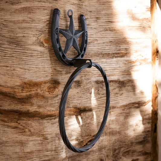 Rustic Western Horseshoe Towel Ring with Barn Star – Heavy Duty Cast & Wrought Iron Wall-Mounted Hand Towel Holder – 11” x 7” – Rustic Brown Finish