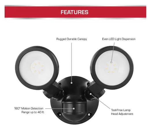 LED Security Light, 2-Head Flood Light, 1000 Lumens, 180° Motion Sensor, 40ft Range, Black