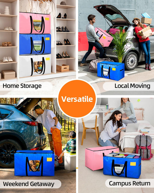 AdeaBag Extra Large Moving Bags, 4 Pack Heavy Duty Storage Bags Boxes Bins Totes with Hnadles Zippers Visible Window for Clothes College Dorm Travel, Blue