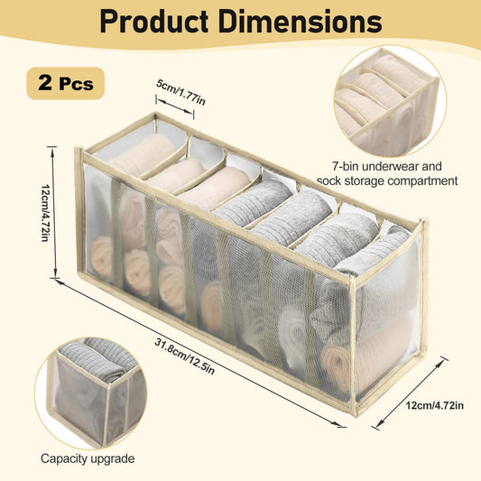 7 Girds Underwear Drawer Organizer Underwear Storage Box Foldable Socks Bra Wardrobe Storage Box(Beige,2Pcs,7 Grids)
