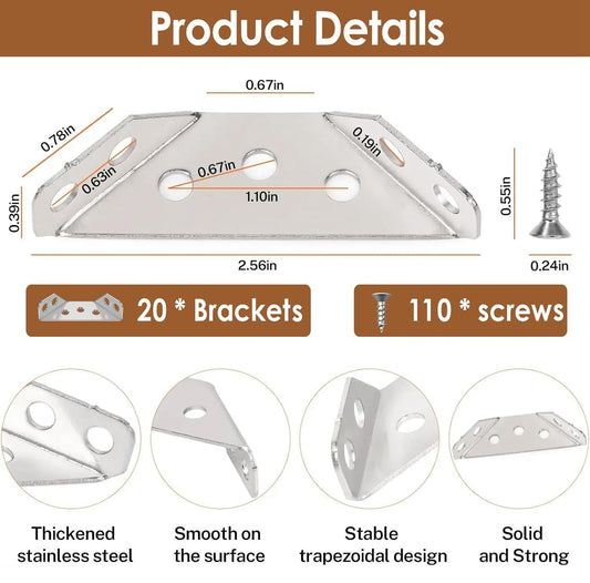 Furniture Corner Connector - 20PCS Universal Stainless Steel L Brackets for Wood,Hardware Metal Angle Bracket Corner Braces,L Bracket for Shelves,Table,Cabinet,Drawer,Corner Brackets for Wood