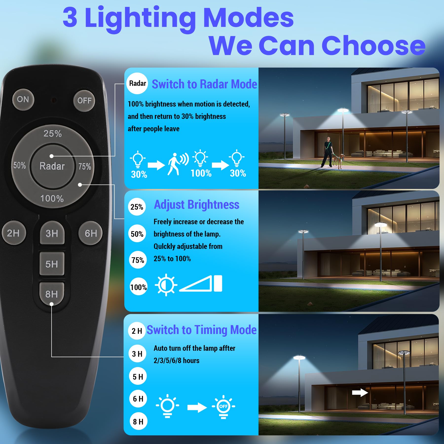 - Multiple modes & Remote Control: Lineba solar pole flood lights outdoor has multiple lighting modes: Mode 1: Dusk to Dawn Mode, where the light turns on automatically at dusk and off at dawn. Mode 2: Motion Sensor Mode, with 100% brightness when motion is detected and 30% brightness when there is no motion. Mode 3:Timed Lighting: 2H/3H/5H/6H/8H. Offering 25-100% brightness adjustment in 4 levels. This outdoor solar street light can be easily adjusted and operated by remote control