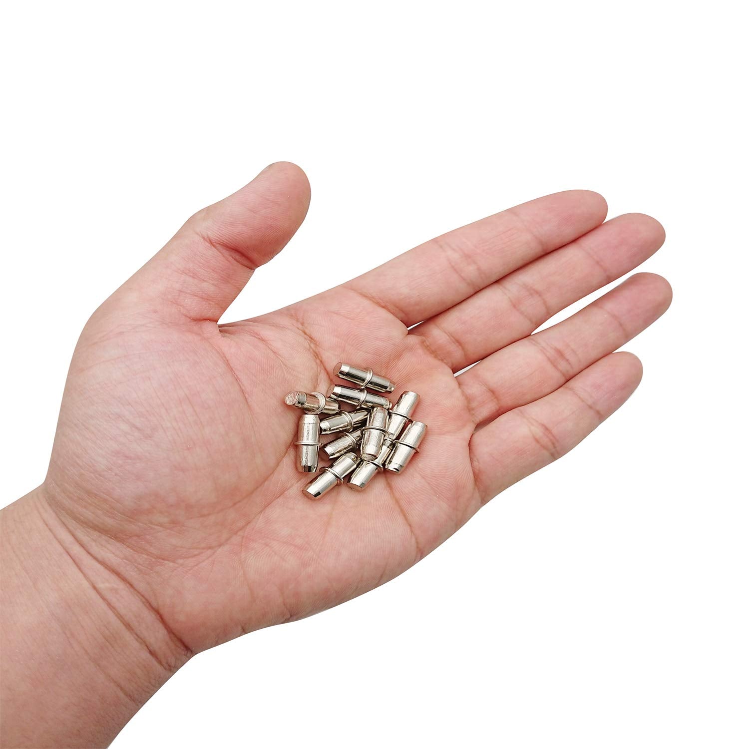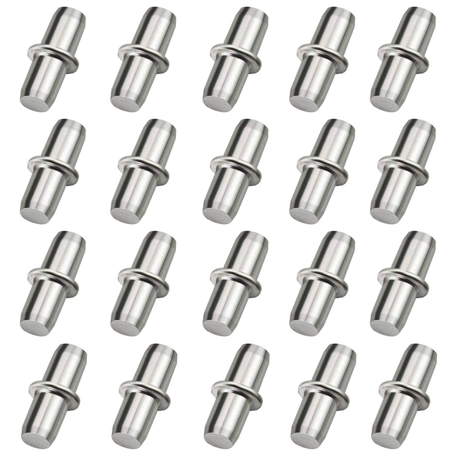 Details: Shelf Supports Pegs Studs Fit For Furniture Wooden Shelves Bracket, Dummy Plate. Made of nickel plated finish iron, integrated modeling, high hardness, strong load bearings, not easy to break, sturdy and durable to use. This Shelf Support Pin is used to support a wooden or glass shelf in place. One end is fixed to the side wall of the furniture or walls. The other end parallel to the ground, 5mm diameter pins require a minimum 3/8 inch deep bore, Used for furniture, especially wardrobes, cabinets, racks, bookcases, entertainment centers and so on.