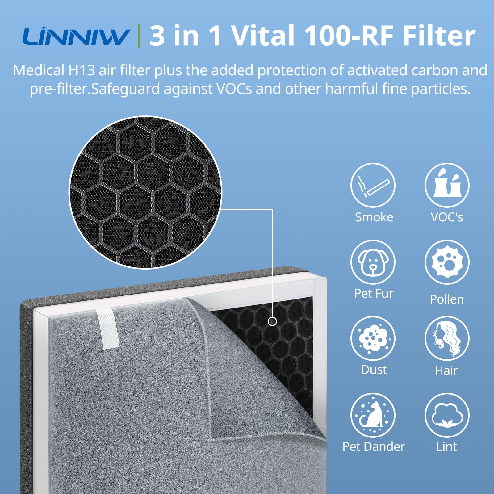 - 【HIGH PERFORMANCE】- Enjoy fresh air with LINNIW Vital 100 HEPA Replacement Filter. Our HEPA filter for levoit vital 100 can achieve a better purificati-on effect than traditional HEPA. The HEPA Filter can help attach 99.97% of the airborne things as small as 0.3 microns such as dust, hair, dander, lint, Activated Carbon filter solve the problem of unpleasant odors and gases including cooking smell, smoke and wildfire gases.