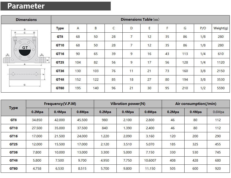 Details: GT10 Pneumatic Air Turbine Vibrator GT Series 1/8" Industrial Pneumatic System Components Turbine Vibrators with hopper Golden Free Muffler (GT-10)