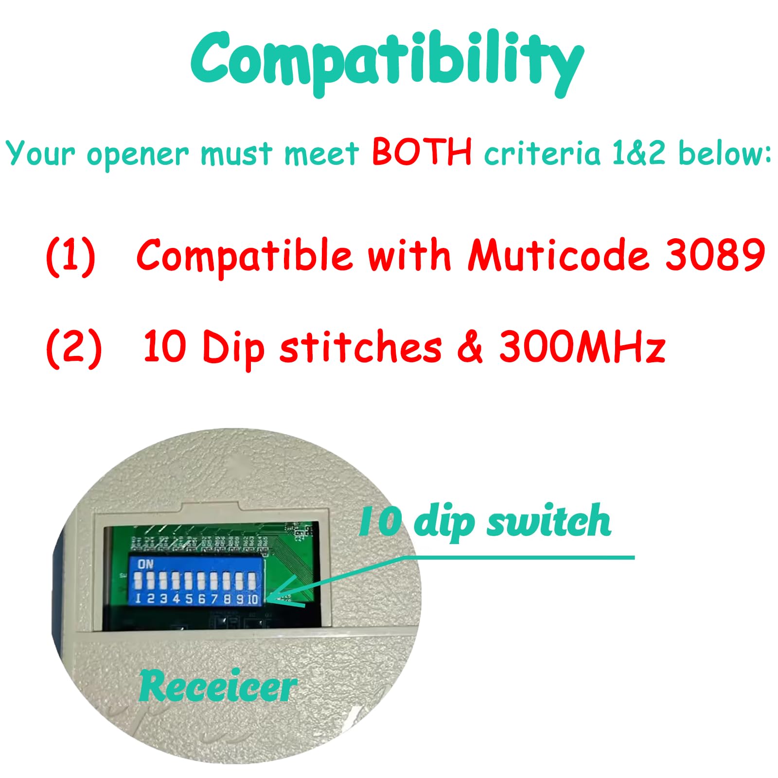 - Replacement for 300MHZ linear Multi-Code 3089 308911 MCS308911,3060 MCS306010,3070 MCS307010 , replacement for generic multicode garage gate door opener remote control multi code transmitter,10 dip switch.