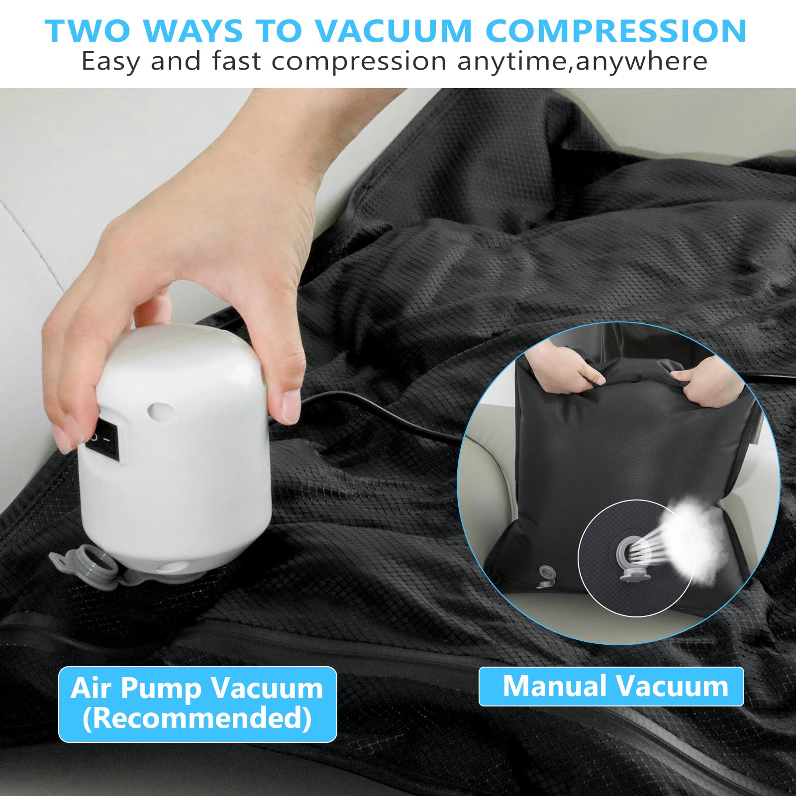 - Fast 20-Second Vacuum Compression – Powered by a high-performance 55W motor, this vacuum pump delivers 5kPa of strong suction and compresses air at a rate of 240L/min. Fully compress your bags in just 20 seconds, saving time and effort while making packing and organizing your clothes faster and easier.