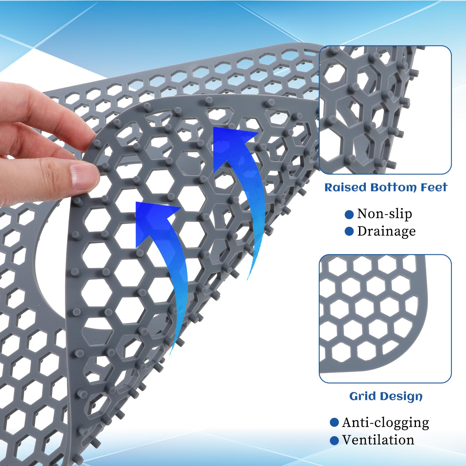 - Raised Feet: Our sink mat bottom and central drain port are both equipped with grid-shaped raised feet, which is not only effective in preventing slipping, but also ensures smooth water flow, and small food residues can also flow down, reducing dirt residue and preventing clogging. The draining mat for kitchen sink has excellent load-bearing capacity, and it can be stable even when heavy pots and tableware are placed.