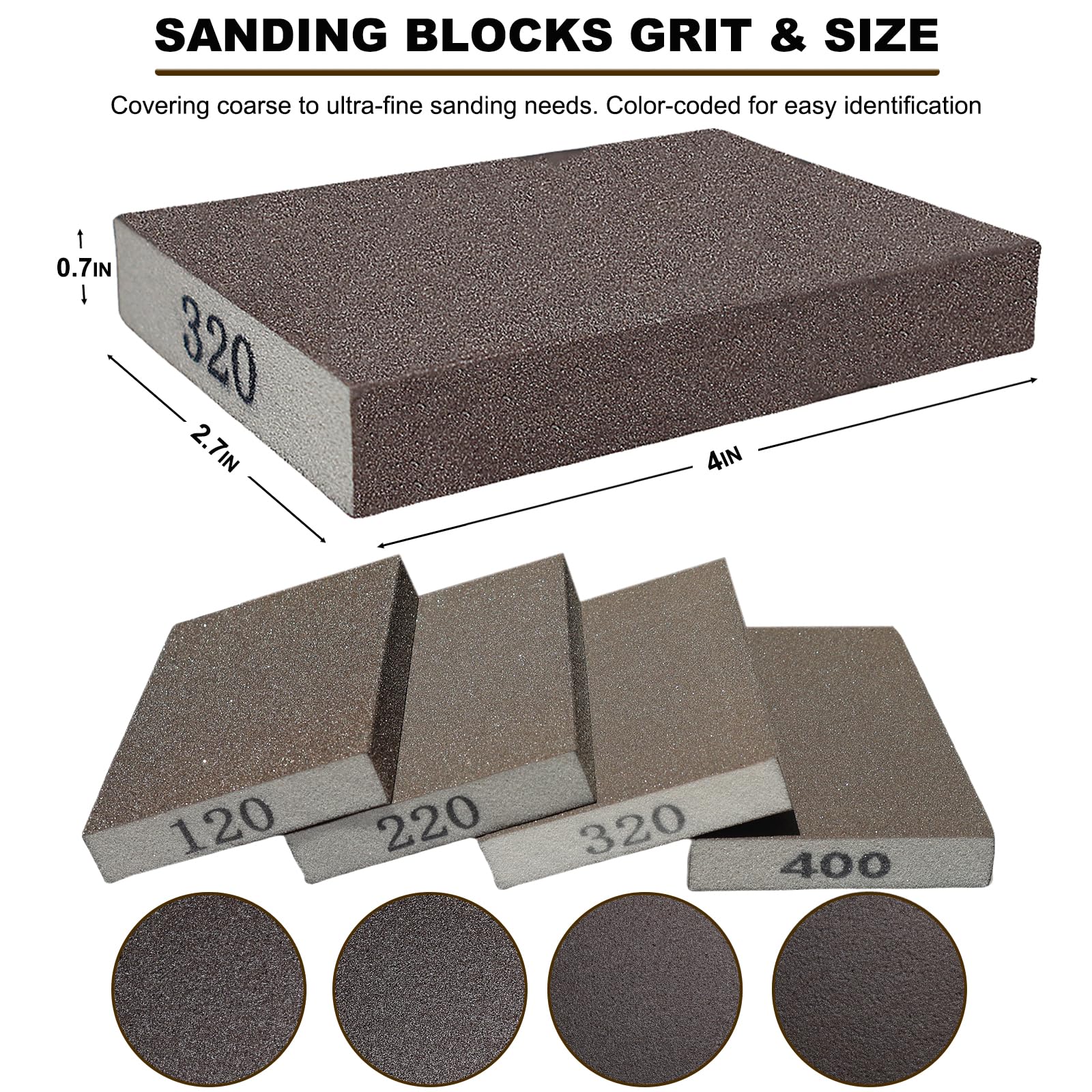 - Assorted Grit Sanding Blocks – This set includes 4 sponge sanding blocks (4 x 2.6 x 0.7 inches) in 120, 220, 320, and 400 grits, covering coarse to ultra-fine sanding needs. Color-coded for easy identification.