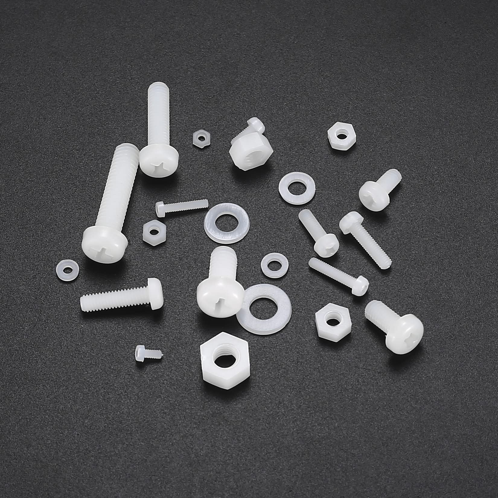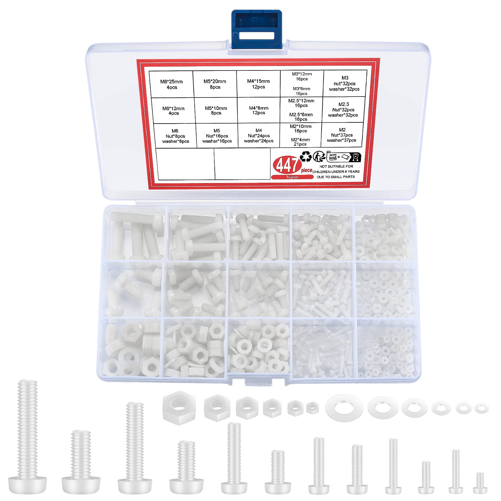- Package Includes: You will receive a total of 447 pcs which nylon hex head screws nuts bolts and washers, in the size of M2/M2.5/M3/M4/M5/M6, including screws, nuts, and washers, enough for your daily use.