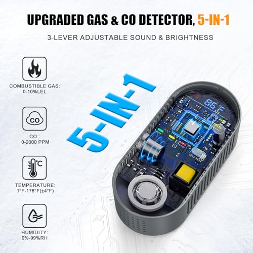 - Upgraded 5-in-1 Carbon Monoxide Detectors and Gas Leak Detector - This Combination gas and carbon monoxide detector Built CO, Gas, Temp, Humidity and Sound, Brightness Control in one detector, Compact design, deliver fast, accurate detection to keep your safety.